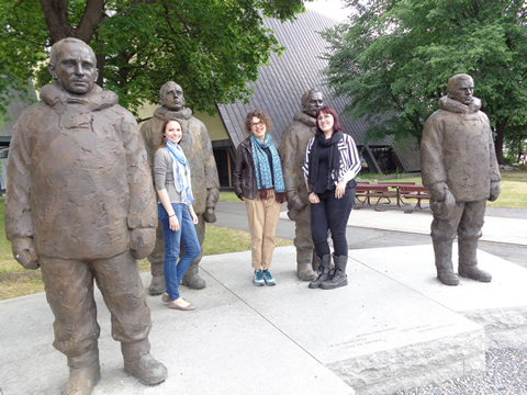 Members of the conference team (left to right) Jennie Wagner, Nele Rein and Laura Sedgwick, alongside the statues for Captain Roald Amundsen and his team of Polar explorers |